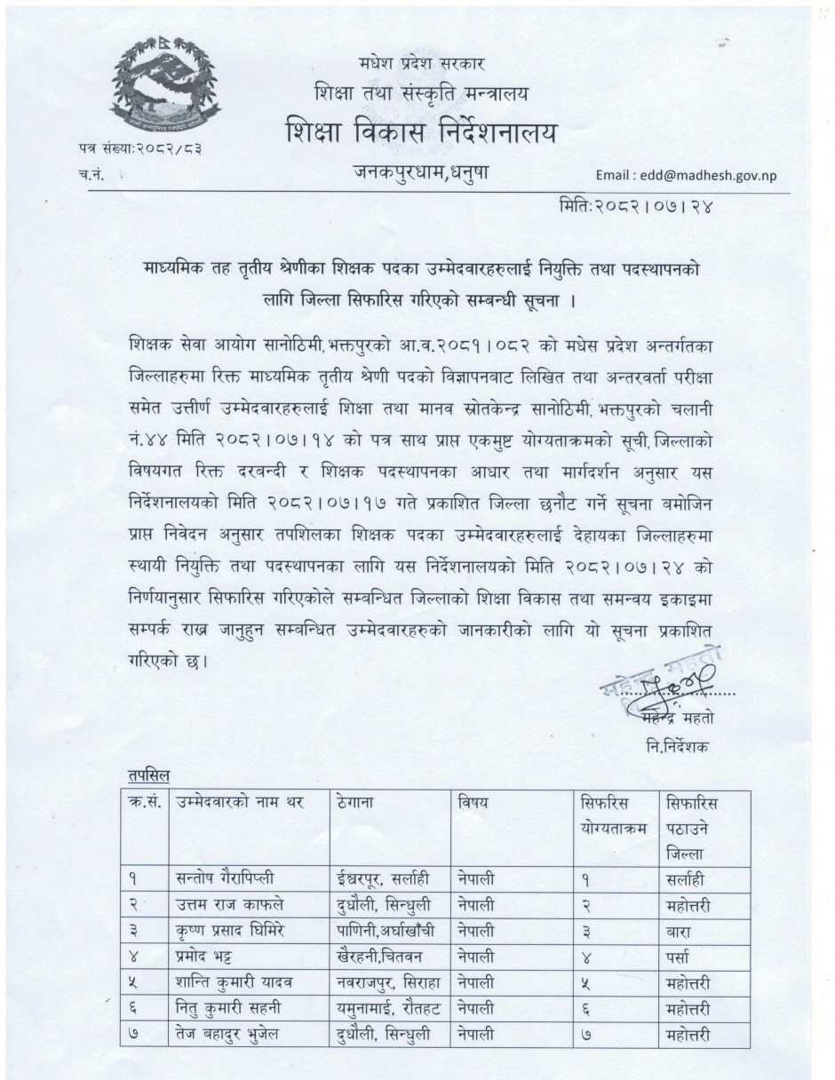 माध्यमिक तह तृतीय श्रेणीका शिक्षक पदका उम्मेदवारहरुलाई नियुक्ति तथा पदस्थापनको लागि सिफारिस गरिएको सम्बन्धी सूचना ।