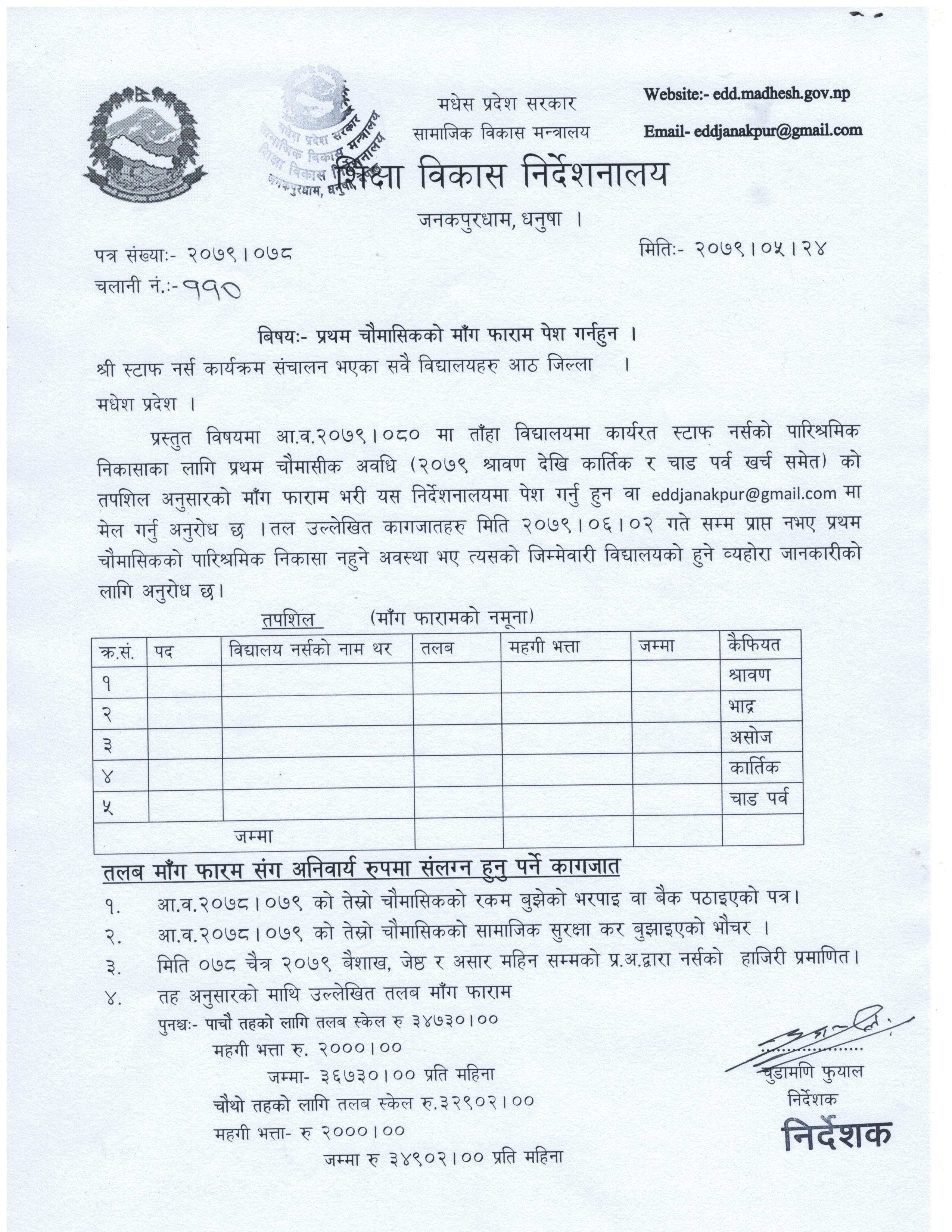 विद्यालय नर्सको तेस्रो चौमासिकको तलब माँग फाराम पेश गर्नुहुन