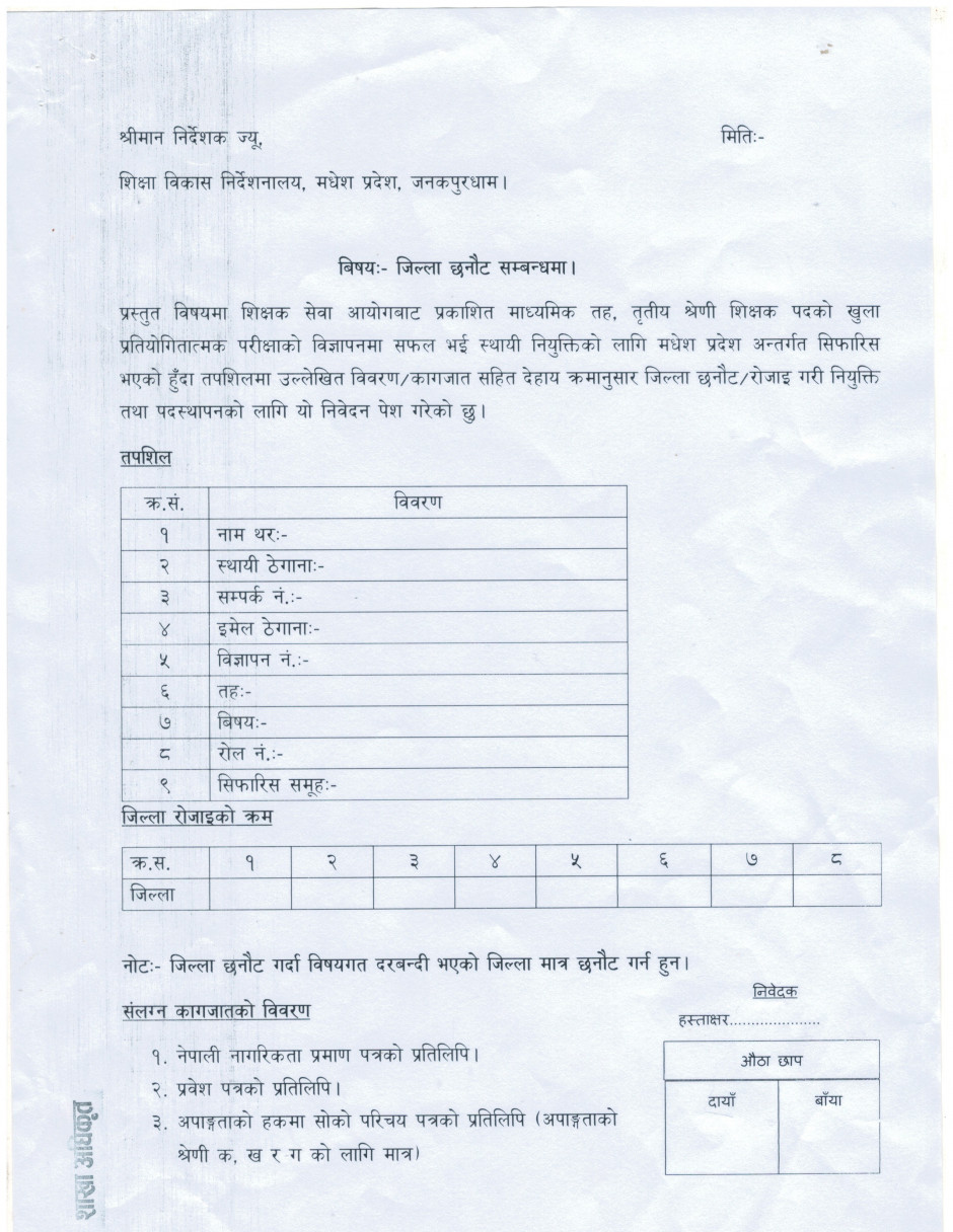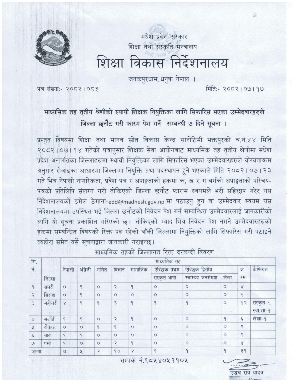 माध्यमिक तह तृतीय श्रेणीको स्थायी शिक्षक नियुक्तिका लागि सिफारिस भएका उम्मेदवारहरुले जिल्ला छनौट गरी फारम पेश गर्ने सम्बन्धी ७ दिने सूचना ।