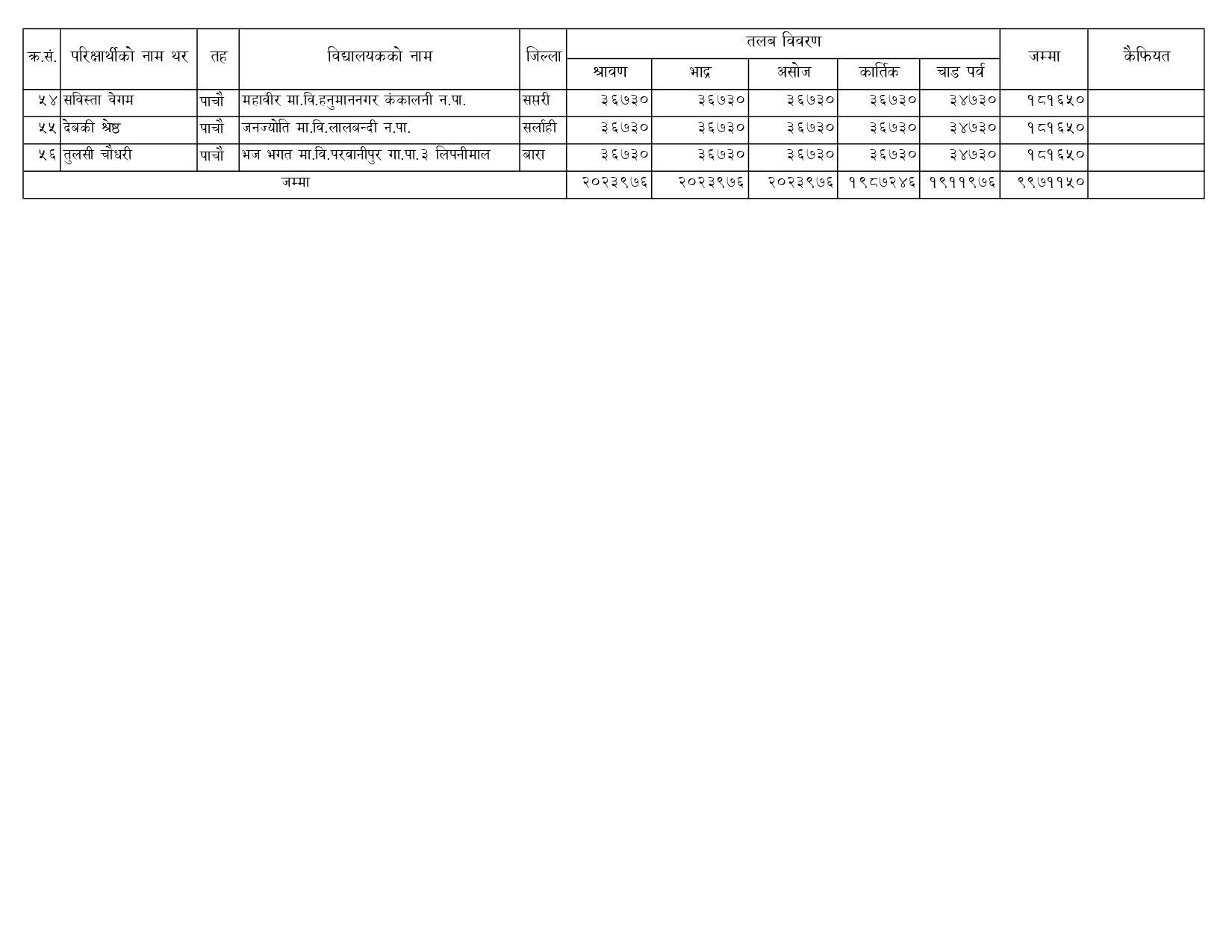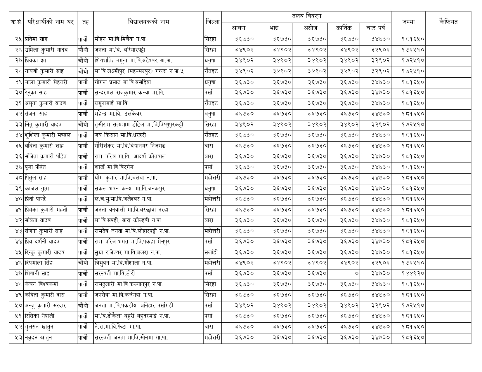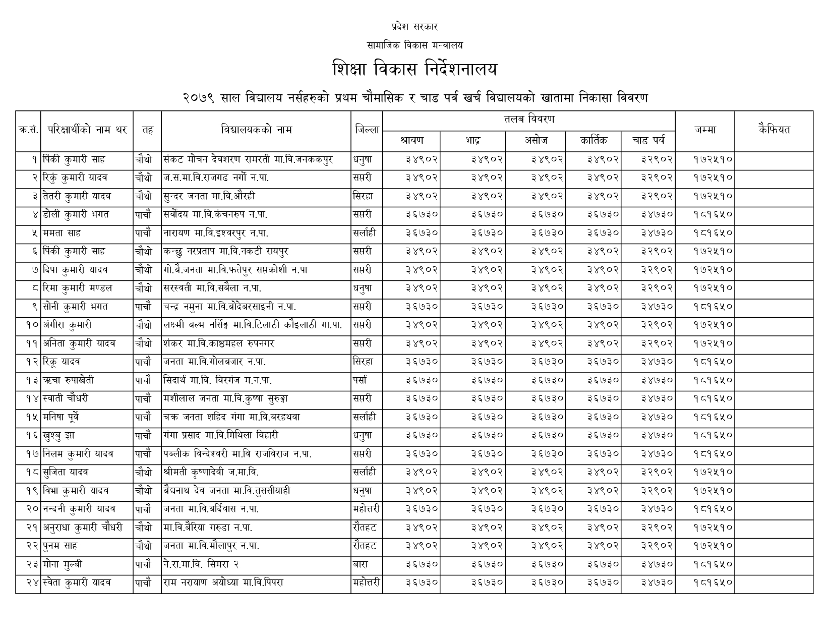 मधेश प्रदेश अन्तर्गत शिक्षा विकास निर्देशनालय मार्फत संचालन रहेको विद्यालय नर्सहरुको २०७९ साल श्रावण, भाद्र,अशोज, कार्तिक महिनाको तलब भत्ता र चाड पर्व खर्च निकासा